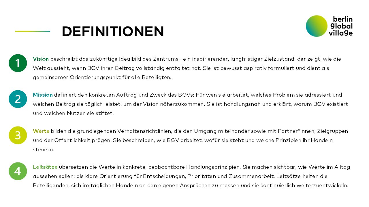 Ein zentraler Schwerpunkt unserer Arbeit in der Geschäftsstelle in 2026 liegt auf der Entwicklung eines Leitbilds für BGV als Zentrum. Dabei handelt es sich um weit mehr als eine reine Pflichtübung oder eine Aktualisierung der Gründungsvisionen. Die Ergebnisse dieses Prozesses werden die Ausrichtung des Zentrums für viele Jahre maßgeblich prägen.